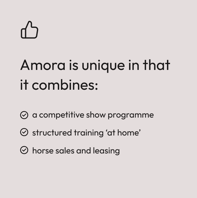 Amora Equestrian is more than a training program — it is a thoughtfully built environment where elite sport, horse-first values, and genuine community exist in balance. We combine high-level performance with a calm, supportive atmosphere, ensuring that horses are prioritized and every rider feels seen, safe, and supported.